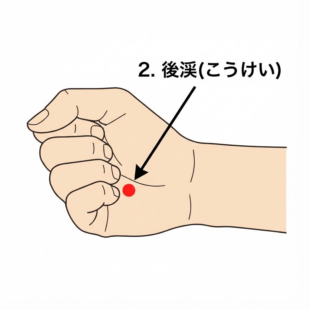 手を軽く握ったときにできる2本目のシワの先端にあるツボです。ヘアピンや爪楊枝の後ろなど、先が丸いもので3〜5回強めに押すと効果的です。
