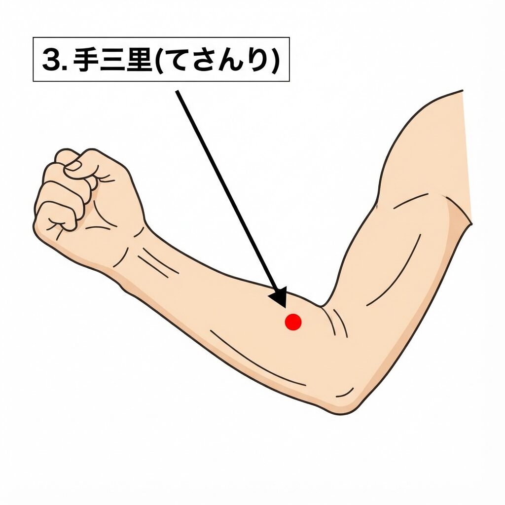 肘を曲げたときにできる横ジワの先端から、手に向かって指3本分移動した場所にあります。もう片方の親指を使って5秒ほど押し、これを3〜5回繰り返します。
