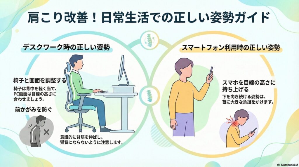 肩こり改善の基本は「正しい姿勢」です。デスクワークをする際は、椅子の高さを調整し、背もたれに背中を軽く当てて座りましょう。パソコンの画面は目線の高さに合わせ、前かがみにならないように注意します。