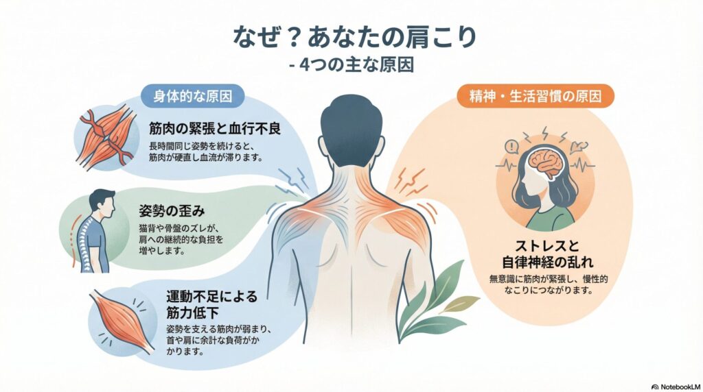 肩こりの原因は、筋肉の緊張、血行不良、姿勢の歪み、ストレス、運動不足など、さまざまな要因が絡み合っています。一時的に薬で痛みを抑えるのではなく、根本原因にアプローチすることが大切です。